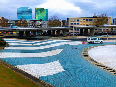 Een ander blauw kunstwerk is de “Blauwe golven”. Politiek is het in discussie, want het lijkt een kale stenen vlakte waar auto’s onder een brug staan geparkeerd . Mijn partij heeft hier een prisoners dilemma. Veel kunstminnende mensen willen dat de golven blijven bestaan. Er is zelfs een heuse website waar ik onderstaande foto’s van heb gejat.
